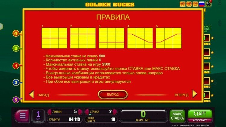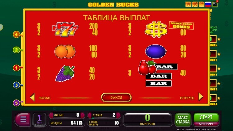Таблица выплат Golden Bucks