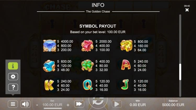 Таблица выплат The Golden Chase